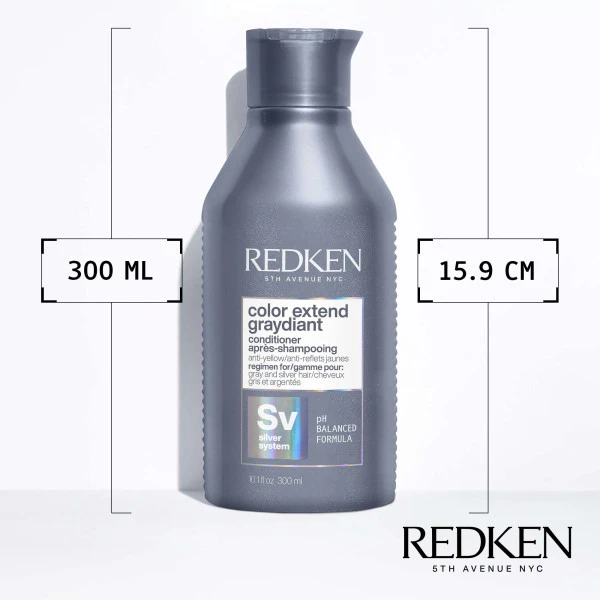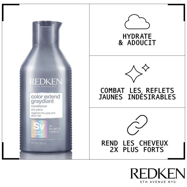 Après-shampooing cheveux gris ou blancs Color Extend Graydiant Redken, pour des reflets jaunes neutralisés et des cheveux gris sublimés.