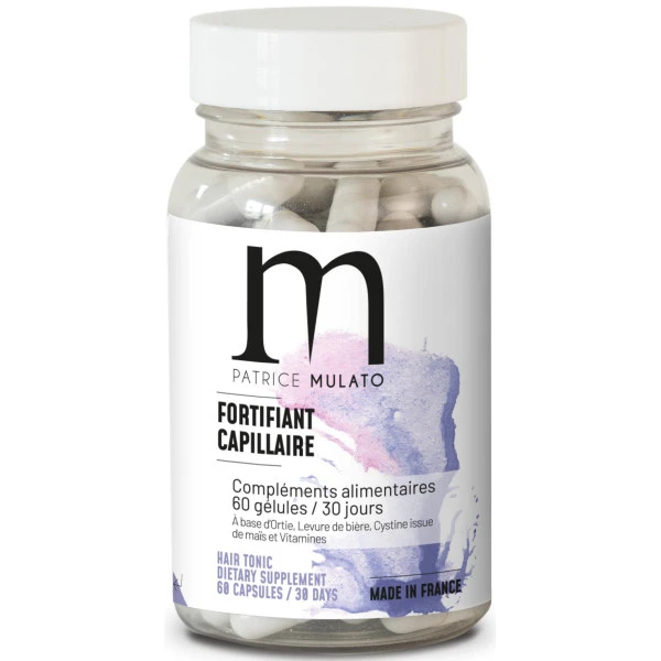 60 gélules fortifiantes capillaires M.expert de Patrice Mulato, à base de levure de bière, d’acides aminés, d’ortie, de vitamines et de zinc, pour redonner de la vitalité et de l’éclat à tous les types de cheveux.