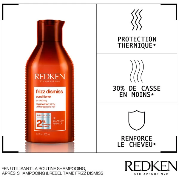 - L’après-shampooing Frizz Dismiss est formulĂ© pour dĂ©mĂŞler les cheveux et les protĂ©ger des agressions extĂ©rieures (pollution, appareils chauffants, humiditĂ©…) qui peuvent les sensibiliser. En tant que vĂ©ritable soin nutritif, l’après-shampooing Redken convient Ă tous les types de cheveux secs et indisciplinĂ©s, qu’ils soient fins ou Ă©pais.
