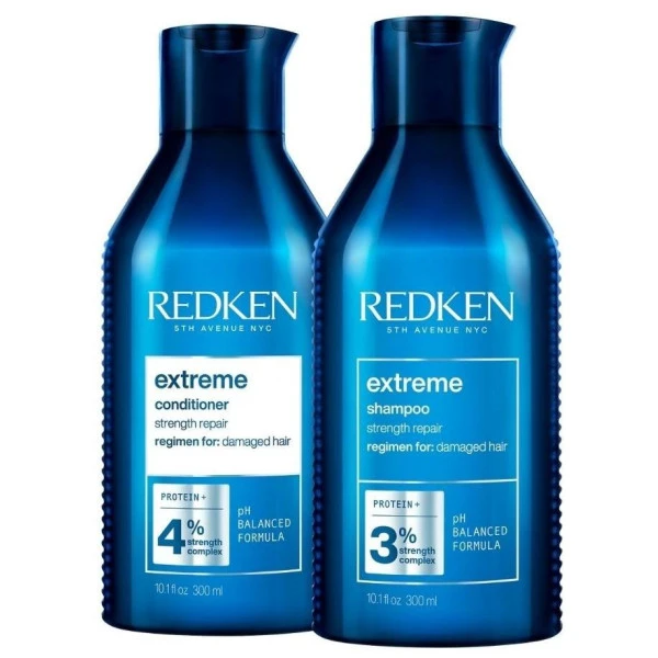 Duo fortifiant Extreme de Redken, pour nettoyer et redonner de la force aux cheveux sensibilisés et cassants.