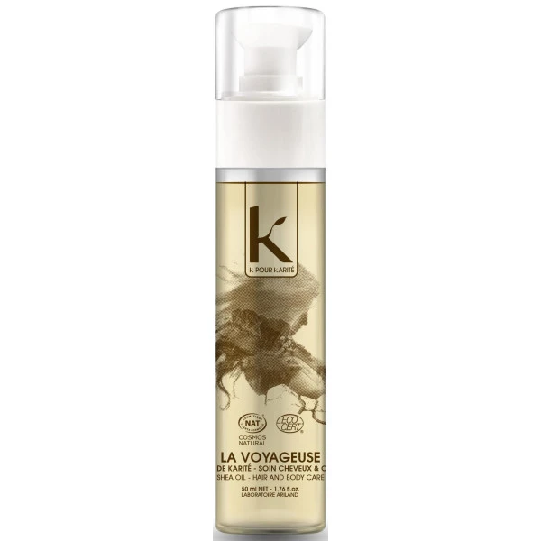 Huile de karité La voyageuse K pour Karité, formulée avec 95% d’ingrédients naturels.