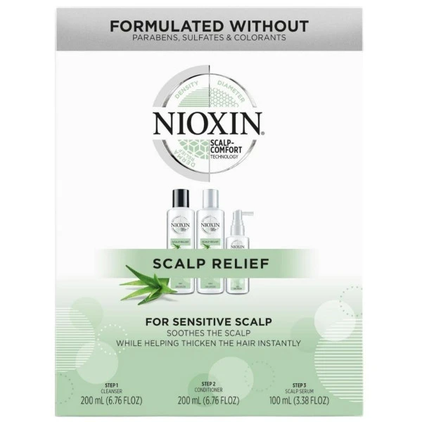 Kit Système Nioxin Scalp Relief en 3 parties pour apaiser les cuirs chevelus sensibles, secs et irrités.