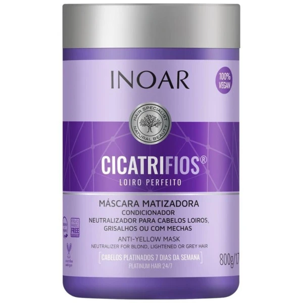 Masque blonde Cicatrifios Inoar, spécialement formulé pour neutraliser les reflets jaunes sur les cheveux blonds, gris ou méchés.