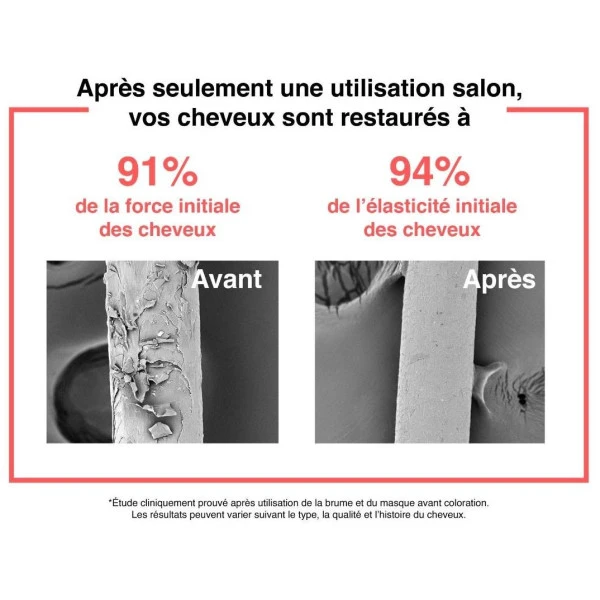 - Soin biomimétique pour reconnecter et réparer les chaînes de kératine des cheveux.