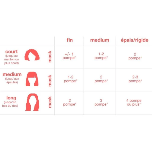 Application : Après le shampooing, et sur cheveux essorés sans avoir démêlé vos cheveux au préalable, appliquez 1 pompe du masque sur chaque section de cheveux. Ajoutez plus de produits si nécessaire en fonction de la longueur et de l’épaisseur. Appliquez de la pointe des cheveux à la racine. Laissez poser 4 minutes. NE PAS RINCER. Coiffez comme à votre habitude.