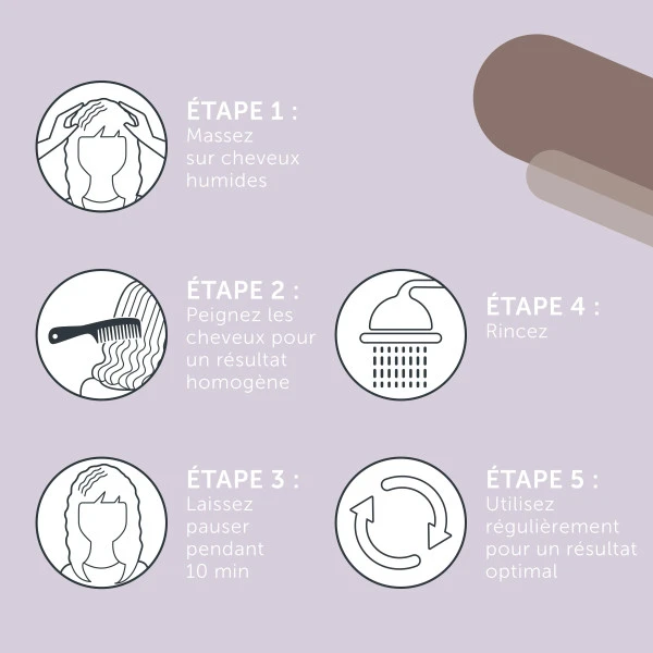 Massez sur cheveux humides et peignez les cheveux pour obtenir un rĂ©sultat uniforme. Laissez poser jusqu’Ă 10 minutes, puis rincez.Ă€ utilisez rĂ©gulièrement pour un rĂ©sultat optimal.