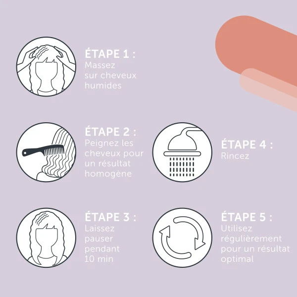 Massez sur cheveux humides et peignez les cheveux pour obtenir un rĂ©sultat uniforme. Laissez poser jusqu’Ă 10 minutes, puis rincez. Ă€ utiliser rĂ©gulièrement pour un rĂ©sultat optimal.