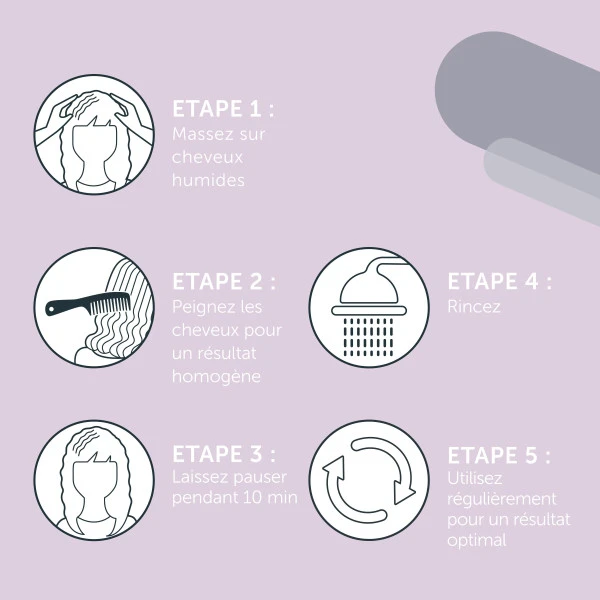 Massez sur cheveux humides et peignez les cheveux pour obtenir un résultat uniforme. Laissez poser jusqu’à 10 minutes, puis rincez. Dure jusqu’à 6 shampooings. Utilisez régulièrement pour un résultat optimal.