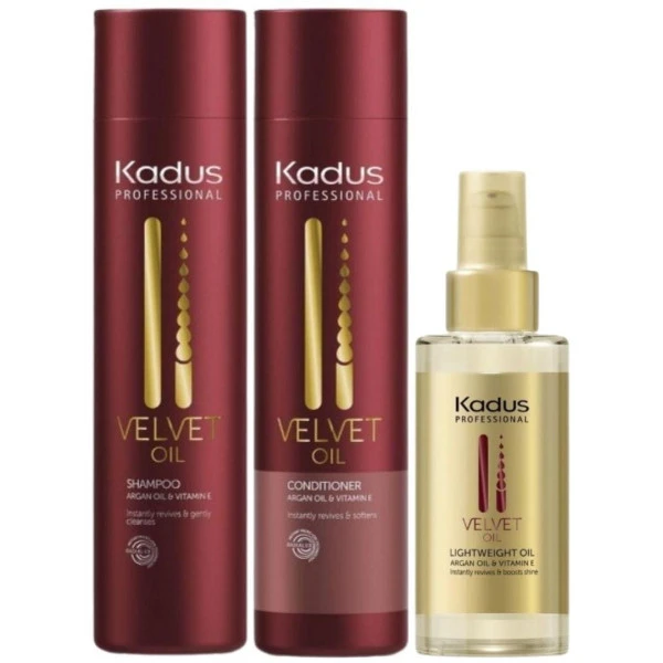 Le trio shampooing, conditionneur & huile Velvet Oil revitalise en douceur et aide Ă revitaliser les cheveux, rĂ©vĂ©lant leur Ă©clat naturel. Ces soins professionnels sont formulĂ©s Ă base d’huile d’argan qui nourrit intensĂ©ment, protège et rĂ©pare les cheveux, et Ă base de vitamine E, un puissant antioxydant qui permet de prĂ©venir les dommages causĂ©s par les UV et les effets du vieillissement, pour des cheveux lisses et naturellement brillants.