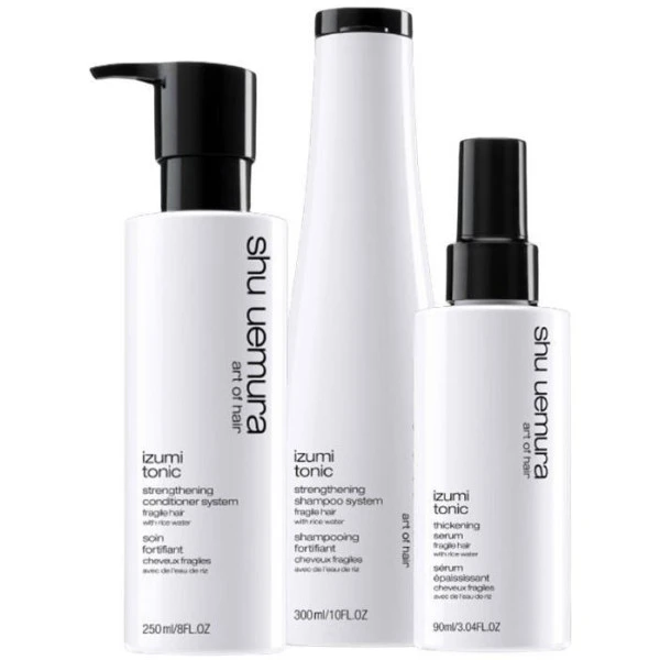 La légèreté du shampooing, la texture crémeuse du conditionneur et la formule précieuse du sérum shu uemura izumi tonic forment un parfait trio pour prendre soin de ses cheveux affinés. Formulés à l’eau de riz et aux céramides (sérum), ces soins hydratent et renforcent les cheveux cassants avec efficacité ! Les cheveux sont beaucoup plus forts et sont protégés de la casse et des fourchues.