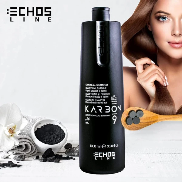Shampoing KARBON 9 au charbon pour cheveux stressés.