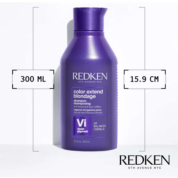 Le shampooing Color Extend Blondage de Redken a pour mission de nettoyer dĂ©licatement la chevelure tout en supprimant les reflets jaunes et orangĂ© indĂ©sirables. Il prĂ©serve l’Ă©clat des cheveux blonds grâce Ă sa formule hautement concentrĂ© en pigments violets sur-mesure. Pour finir, il rĂ©pare aussi la fibre capillaire grâce Ă un complexe protĂ©ique triple-acides.