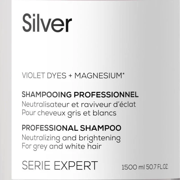 Le shampooing Silver Serie Expert de L’Oréal Professionnel a été conçu pour répondre aux besoins des cheveux argentés, victimes des reflets indésirables. Formulé à partir de magnésium acétate, il donne un coup de boost, de brillance et de douceur à la chevelure ! Associés à cet actif, les pigments violets intenses du shampooing Silver viendront cibler les reflets jaunes et cuivrés disgracieux pour les neutraliser. À vous les nuances argentées froides qui sublimerons votre look. Les cheveux seront radieux : soyeux, éclatant, souples et plein de légèreté.