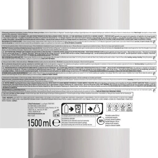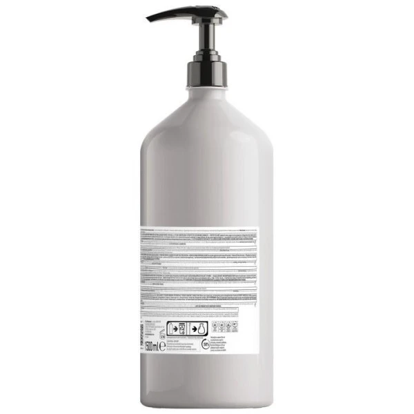 Shampooing Silver L’Oréal Professionnel, l’alliance incroyable de pigments violets et de magnésium acétate pour neutraliser les reflets jaunes des cheveux gris.