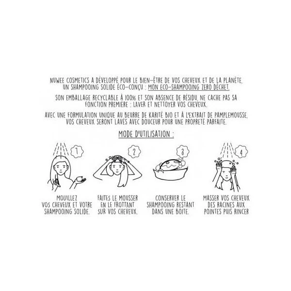 Application : Démêlez vos cheveux avant son application, pour faciliter l’intégration du produit. Dans un premier temps mouillez vos cheveux ainsi que le shampooing solide puis faites le mousser sur vos cheveux en le frottant. Massez vos cheveux des racines aux pointes comme un shampooing classique puis rincez. Conservez le reste du shampooing solide dans une boîte.