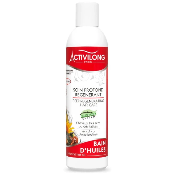 Application : appliquer le soin profond bain d’huile Activilong sur cheveux lavés et essorés. Laisser poser, puis rincer.