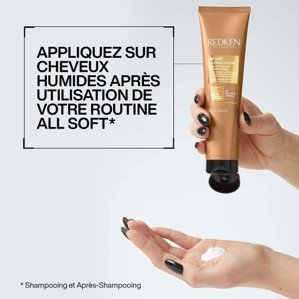Soin sans rinçage hydratant cheveux secs All Soft Redken, pour les cheveux secs et rêches.