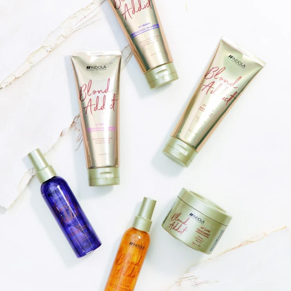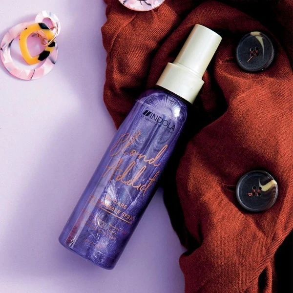 Afin d’obtenir un blond encore plus froid, il est conseillĂ© d’utiliser ce spray avec les autres soins cheveux de la gamme Blond Addict d’Indola.