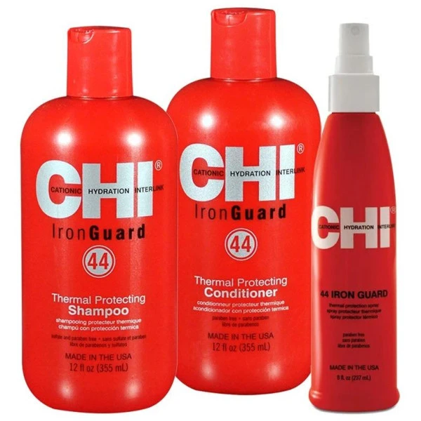 - Le shampooing 44 Iron Guard de CHI nettoie les cheveux avec douceur et les dĂ©barrasse des impuretĂ©s accumulĂ©es au cours de la journĂ©e. Sa formule offre Ă la chevelure un coup de boost en lui procurant des vitamines A et E et des protĂ©ines. Ces actifs vont venir renforcer la fibre capillaire, la nourrir et la prĂ©parer Ă l’utilisation des appareils chauffants Ă©lectriques. Il nettoie dĂ©licatement, renforce avec des vitamines A et E et des protĂ©ines, nourrit la fibre et protège de la chaleur des appareils Ă©lectriques.